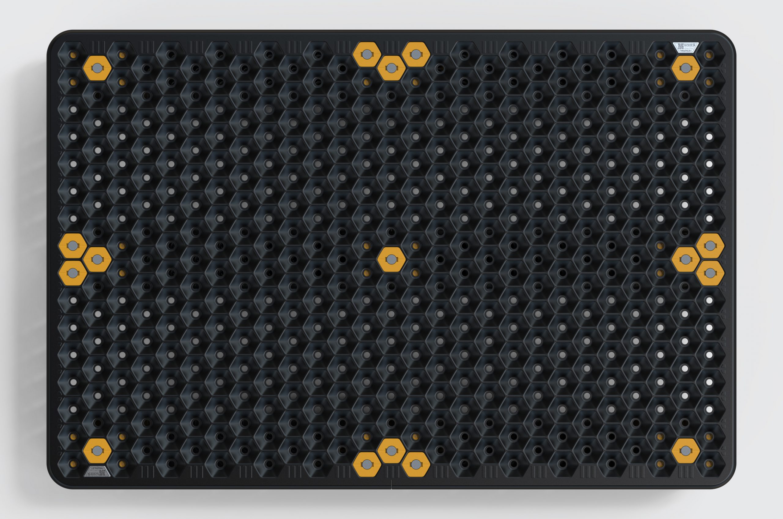 The concept is based on a spaceframe design in which two press formed metal sheets are mounted on top of each other forming an array of pods that act as a three-dimensional truss construction, providing a very light and rigid structure with an extremely high load-bearing capacity.